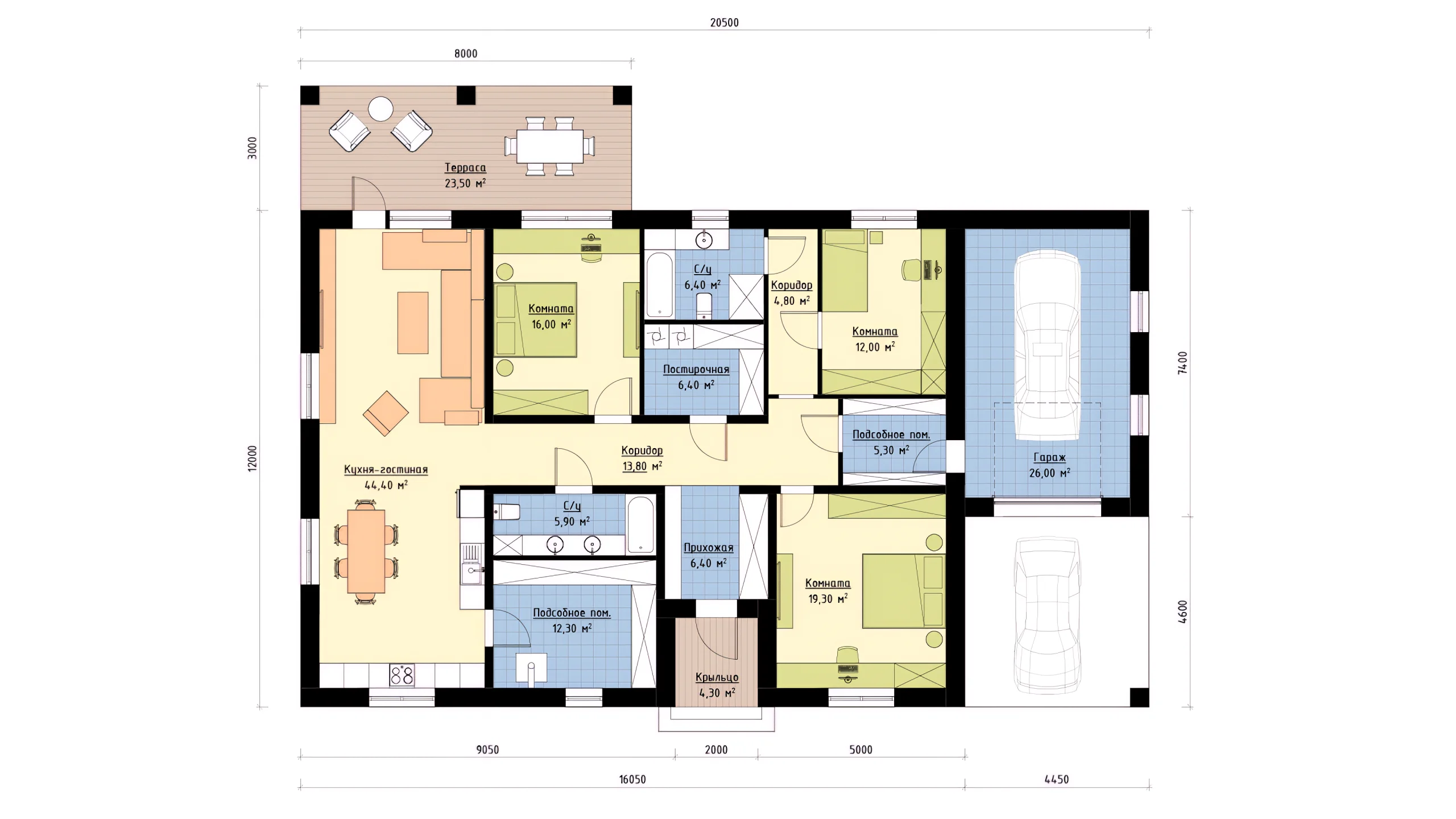 Отдельно стоит отметить бытовую зону. Постирочная, гараж и входная группа работают как единая система: грязь, техника, хранение — всё остаётся вне жилого пространства. Это то, что напрямую влияет на ощущение порядка в доме уже через месяц после заселения.