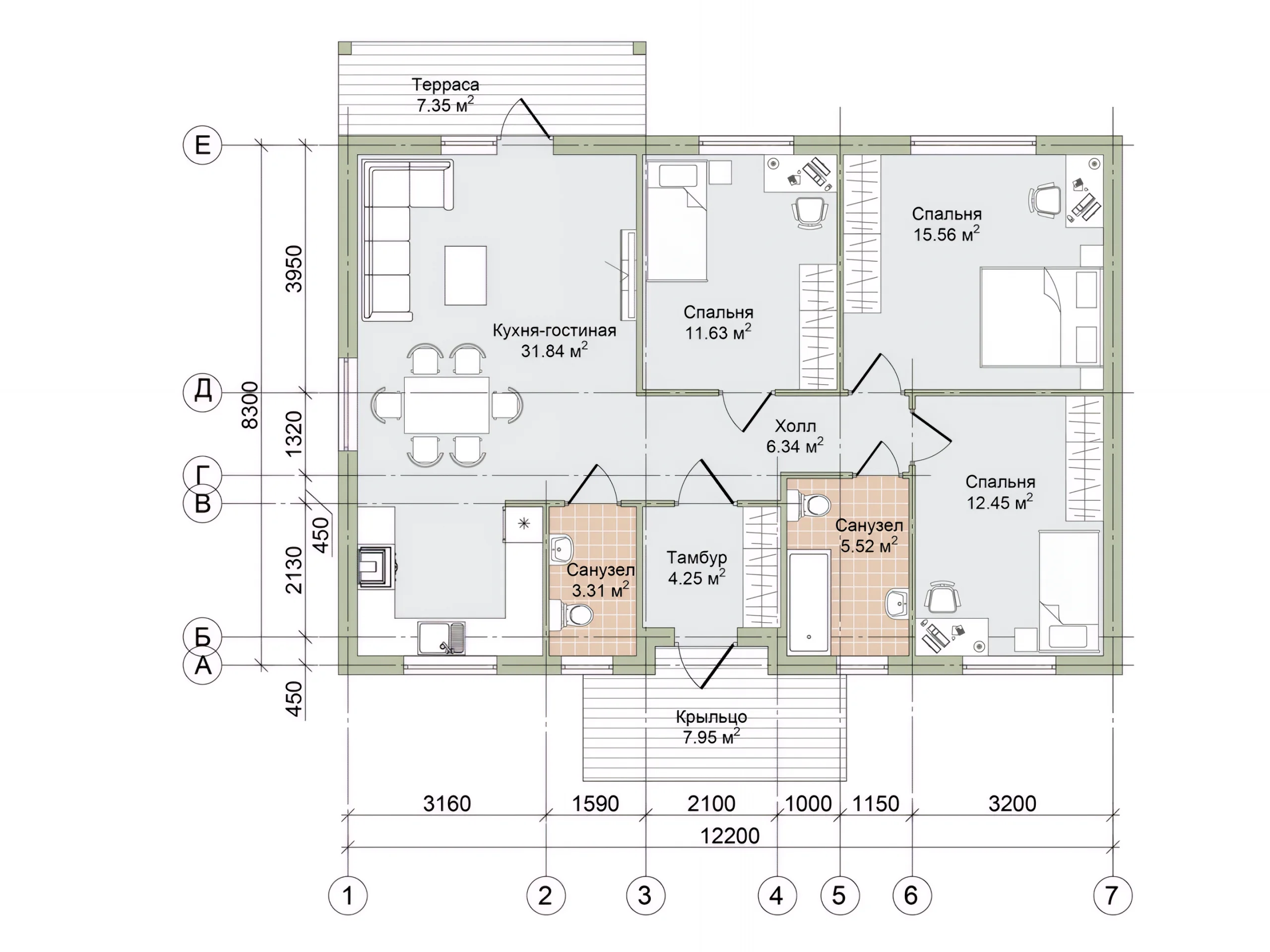 «Брага» — это пример того, как на относительно небольшой площади можно получить функциональность более крупного дома. Три спальни и два санузла — редкое сочетание для 115 м², которое позволяет избежать компромиссов в повседневной жизни.