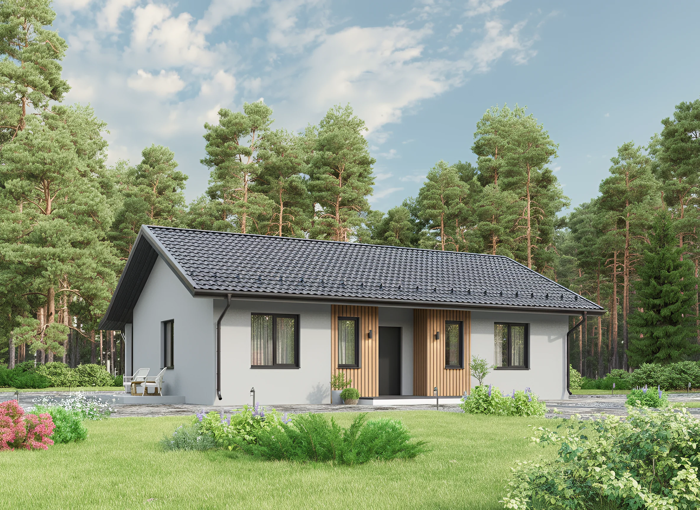 Одноэтажная структура делает дом максимально удобным в эксплуатации. Нет лестницы — значит проще перемещения, уборка и организация быта. Это особенно важно, если в семье есть дети или планируется долгосрочное проживание.