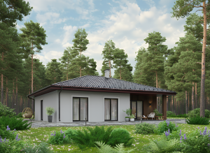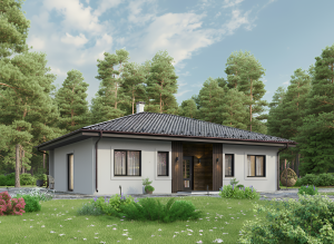 В доме предусмотрены три спальни, что делает его гибким под разные сценарии: семья с детьми, работа из дома или частые гости. Два санузла распределены так, чтобы снизить нагрузку в утренние и вечерние часы. За счёт одноэтажного решения все помещения находятся в быстром доступе, что особенно удобно в повседневной жизни.