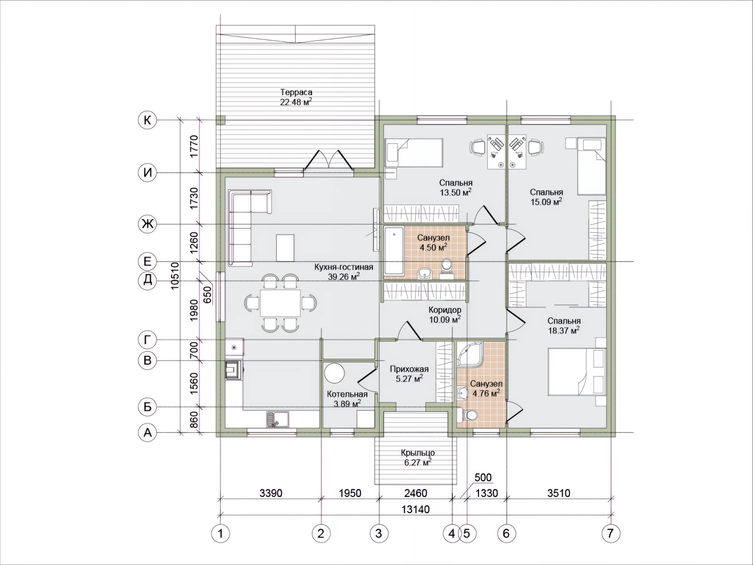 В базе уже учтены все ключевые помещения: кухня-гостиная, три спальни, два санузла и терраса. Это позволяет избежать доработок проекта и держать бюджет строительства под контролем.