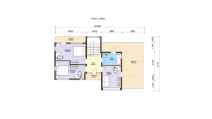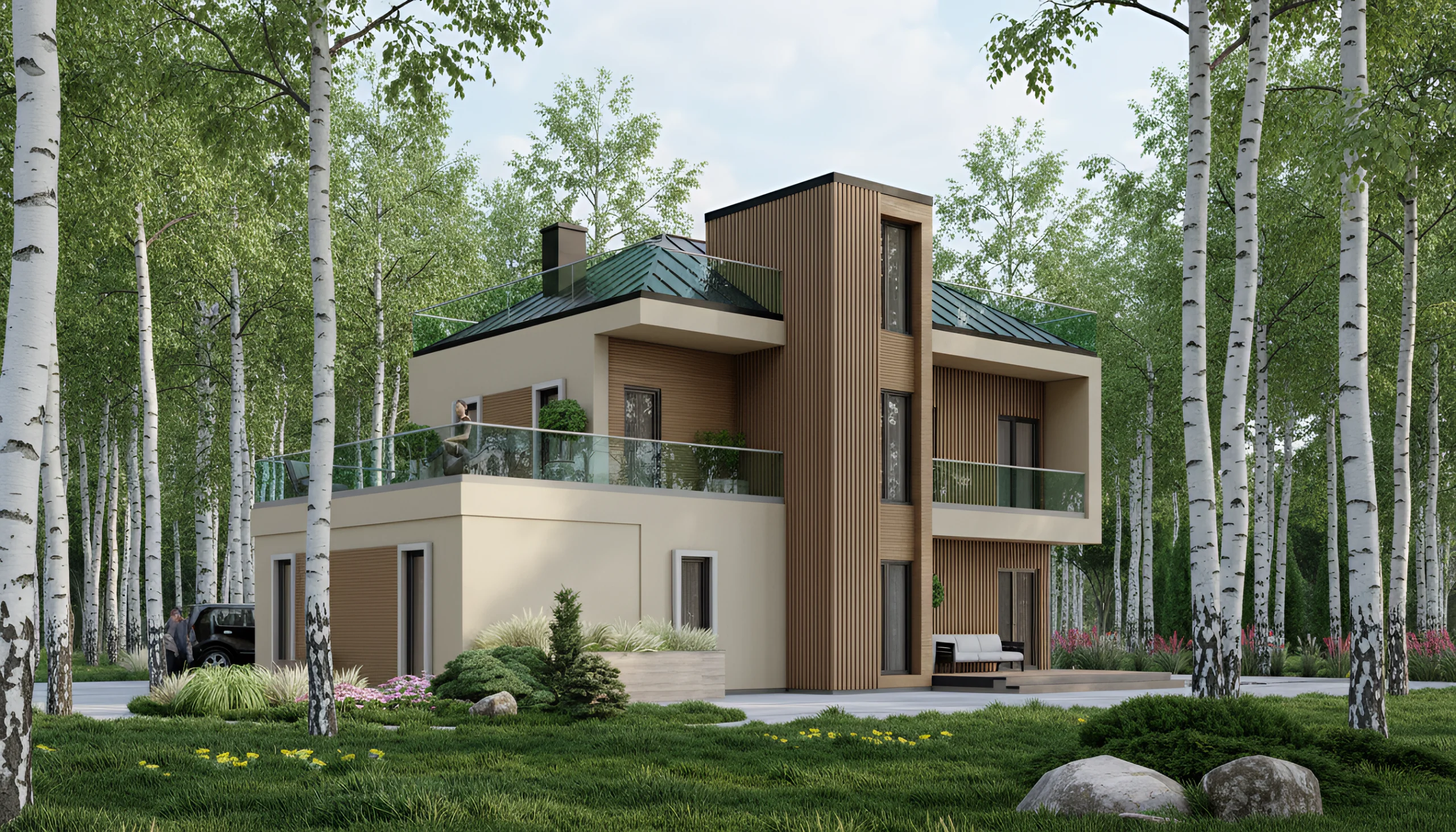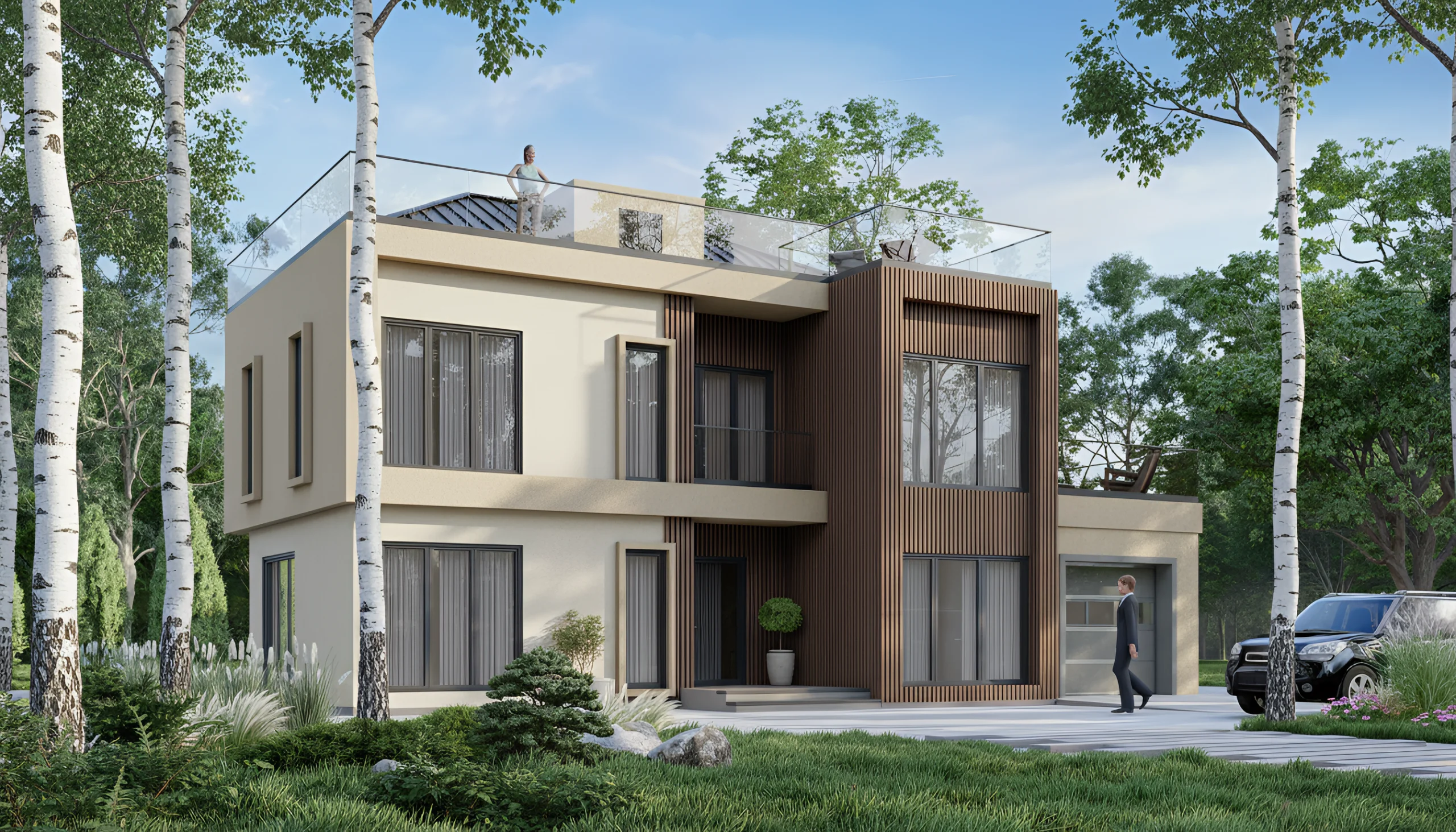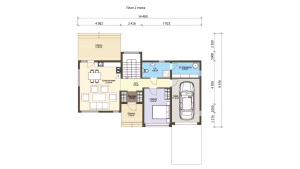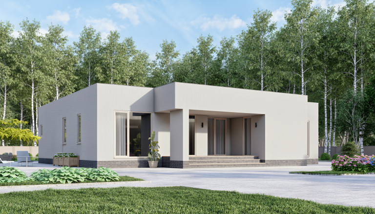 При габаритах 14,4 × 9,7 м дом оптимально размещается на участке от 8–10 соток, комфортно — от 10–12. Важно учитывать не только сам дом, но и подъезд, парковку, отступы от границ и зону отдыха. За счёт двухэтажной схемы дом занимает меньше площади на участке, чем одноэтажные аналоги, поэтому остаётся больше свободного пространства под двор, террасу и озеленение. Это особенно важно, если участок не очень большой и нужно сохранить функциональность территории.