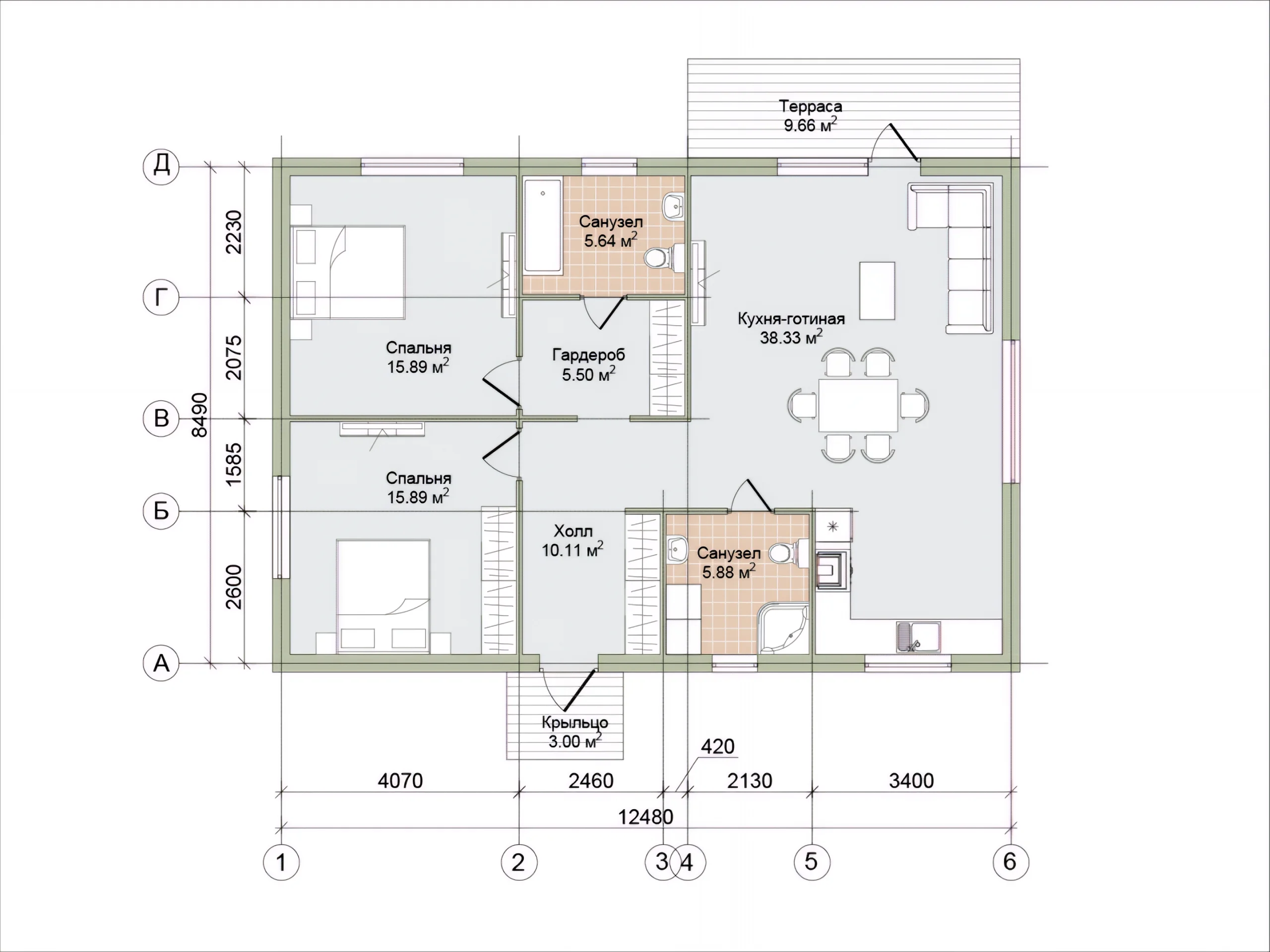Проект изначально оптимизирован: компактные размеры, простая архитектура и отсутствие сложных конструктивных узлов позволяют держать бюджет под контролем. При этом наличие двух санузлов и просторной общей зоны не требует значительного удорожания за счёт грамотной планировки.