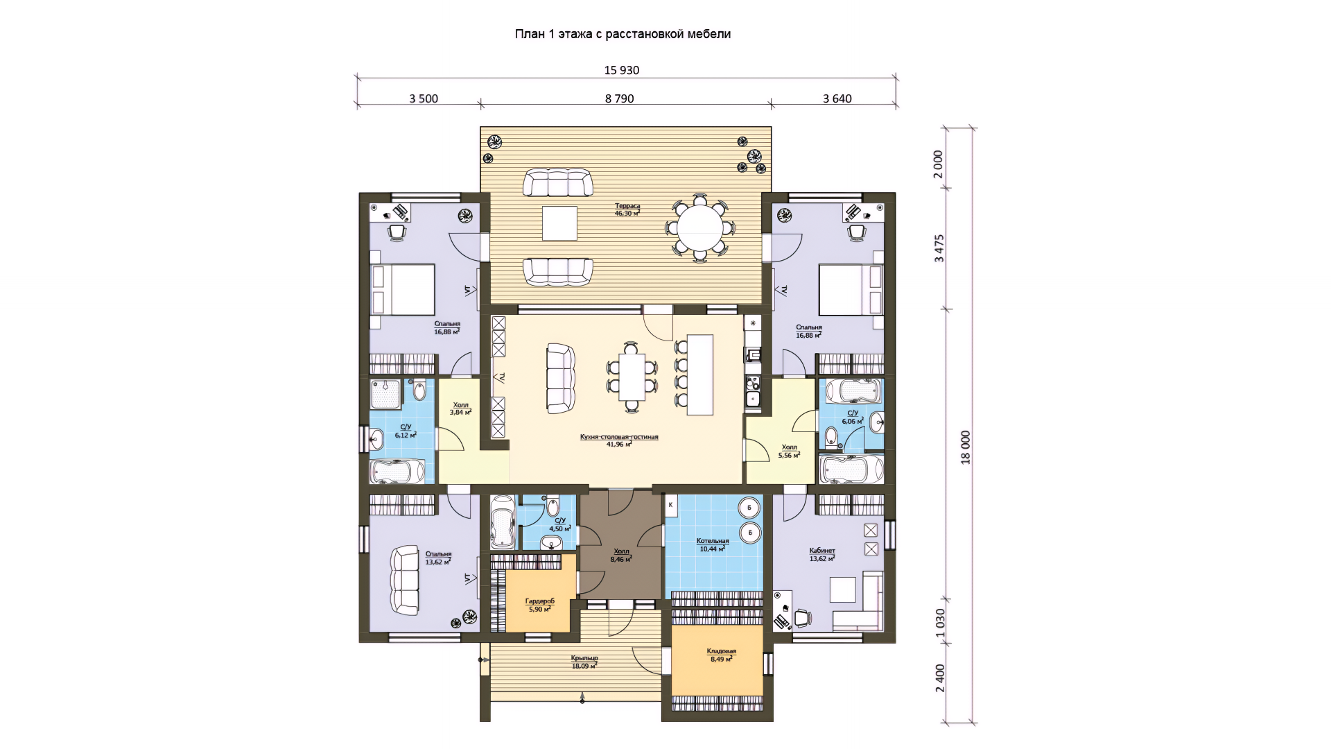 Один из ключевых плюсов — это комфорт на уровне более крупных домов, но без избыточной площади. Здесь есть всё необходимое: три спальни, три санузла, кабинет, кладовая и большая общая зона, при этом пространство остаётся логичным и удобным.